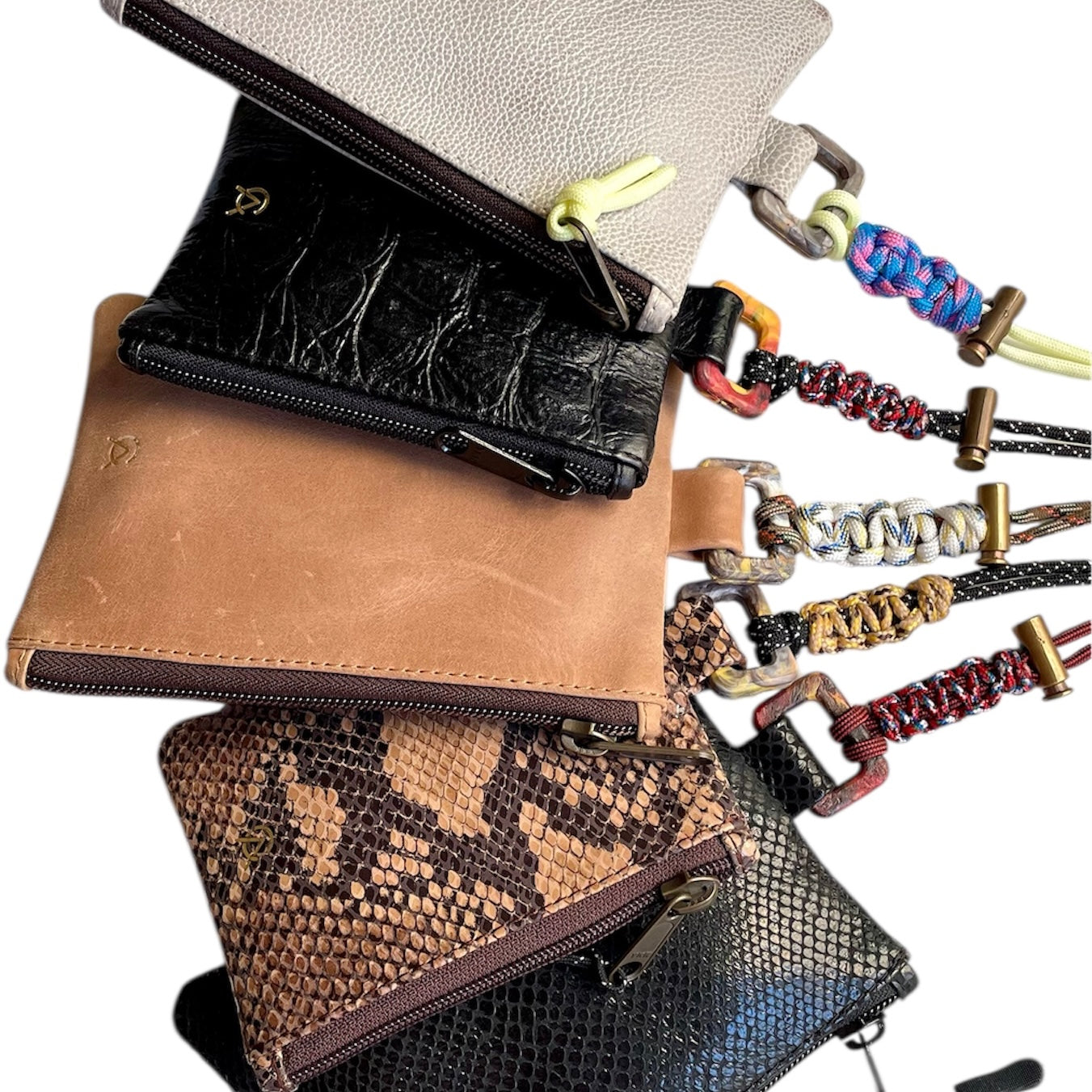 Hanging charm pochette with zipper, recycled plastic brooch and handmade knitted paracord...